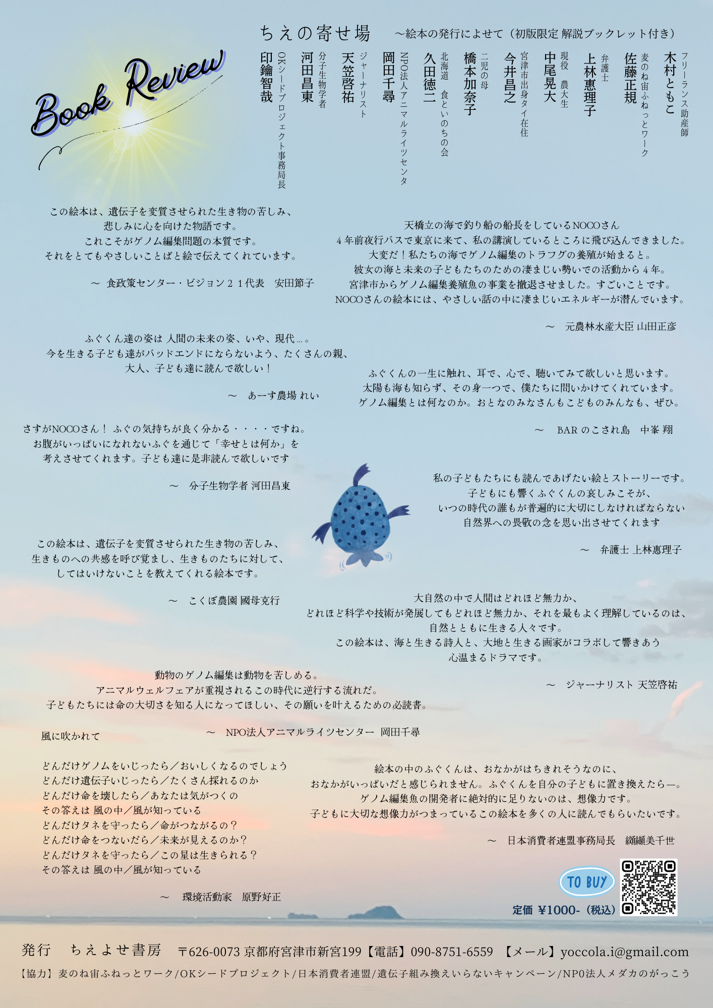 「世界中のどの場所でも、ゲノム編集魚を作り出さないでほしい」、未来に向けてそう強く願うNOCOさんが、この問題から伝えたいことを、このたび1冊の絵本にしました。「ゲノム編集」や生と死や倫理観などを教えるにはまだ難しい小さなお子さんも、「いのち」というものを感じることができる作品です。絵本の発売まで、あともう少し。