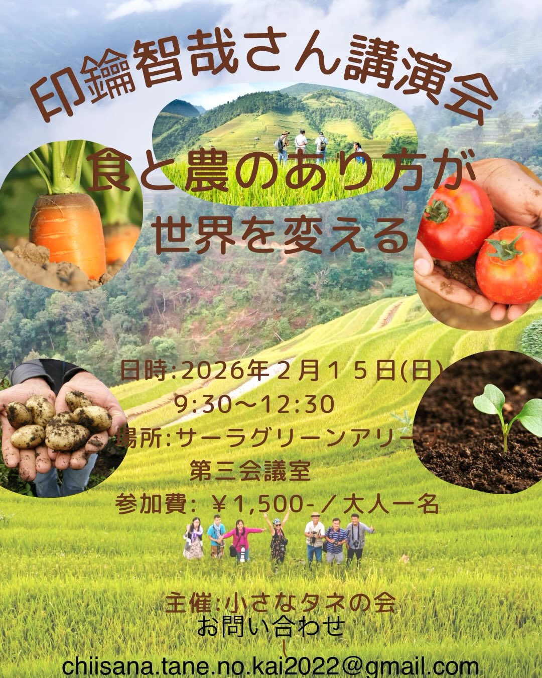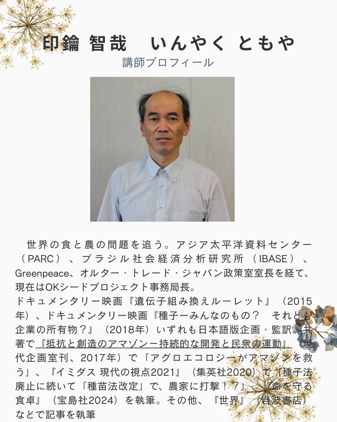 このたび、OKシードプロジェクト事務局長の印鑰智哉(いんやく・ともや)さんをお迎えし、講演会「食と農のあり方で世界が変わる」を開催します。