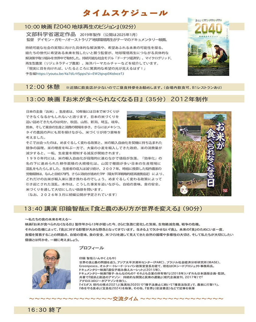 映画『お米が食べられなくなる日』製作年から13年が経った今、さらに急激に変化した気候、生物絶滅危機、戦争の危機。それらの危機によって、『食』に対する影響が大きな懸念となってきています。生きる上で欠かせない『食』。未来の『食』のためにいま一度、食糧を貿易することの問題点、自給の意味、食の安全、米づくりを通して見えてきた自然の循環や多様性の大切さ、そして私たちが大切にしたい価値とは何かを、一緒に考えましょう。