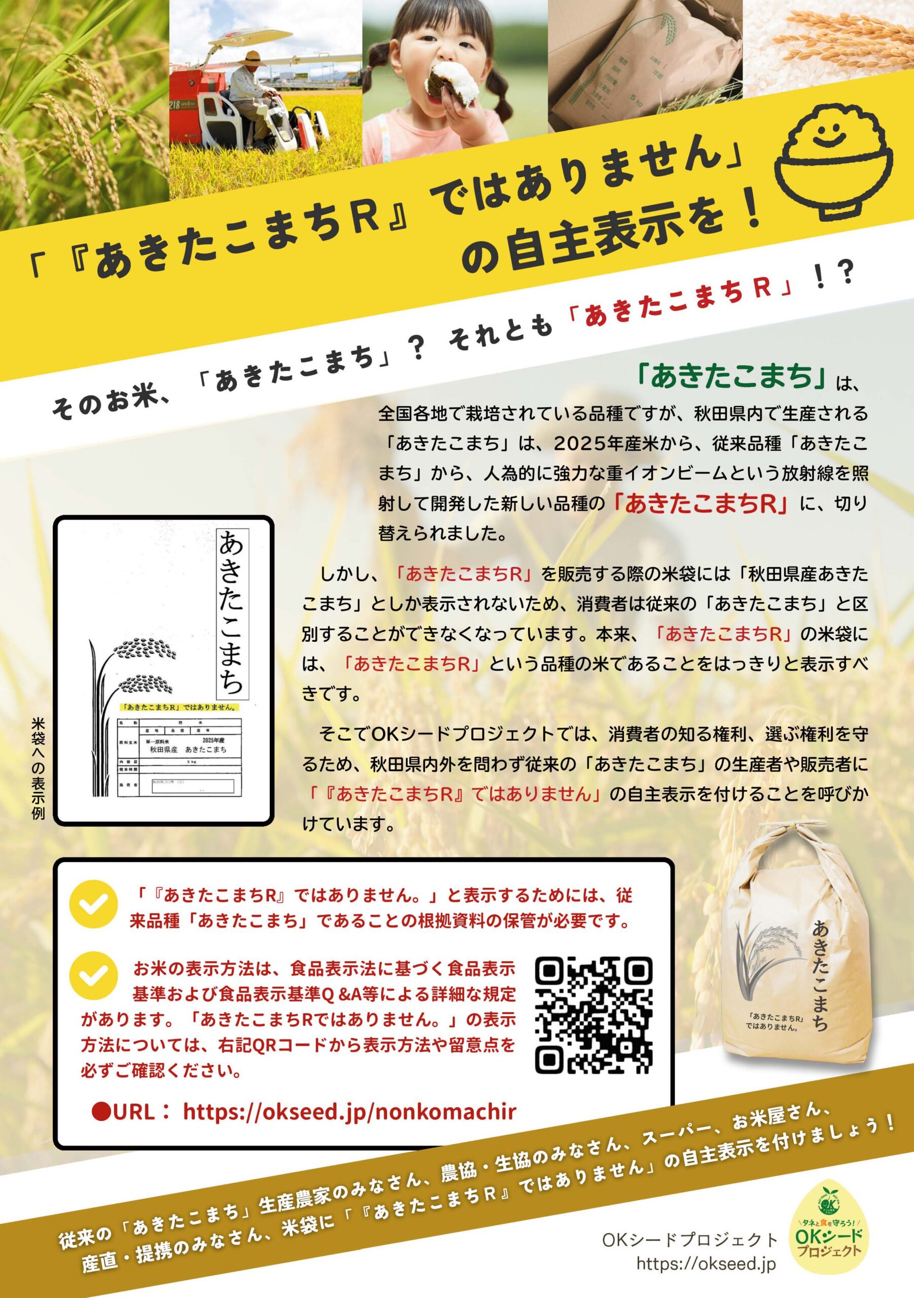 「あきたこまちRではありません」の自主表示を呼びかけるチラシができました。PDFはこちらからダウンロードできます。