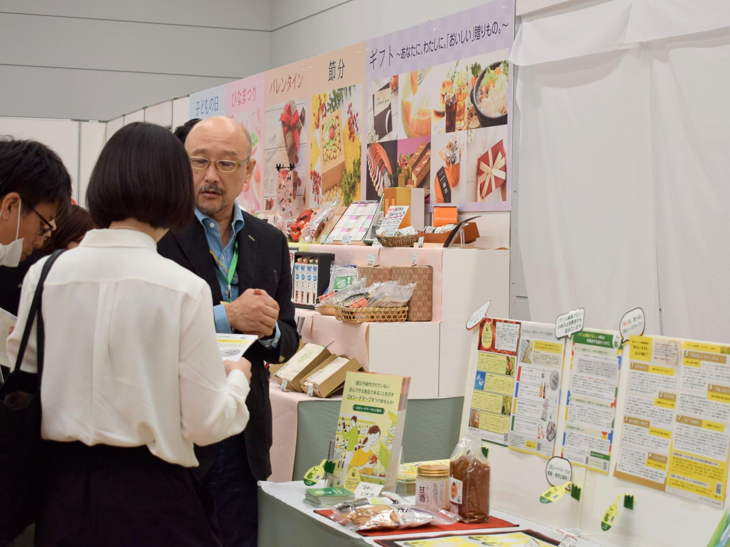全国から集まったメーカーさんや小売店のみなさんに、「OKシードマーク」をPRさせていただきました!健康や環境にやさしい、こだわりの商品がズラリと並ぶ会場は、たくさんの笑顔と弾む会話で大盛況でした。