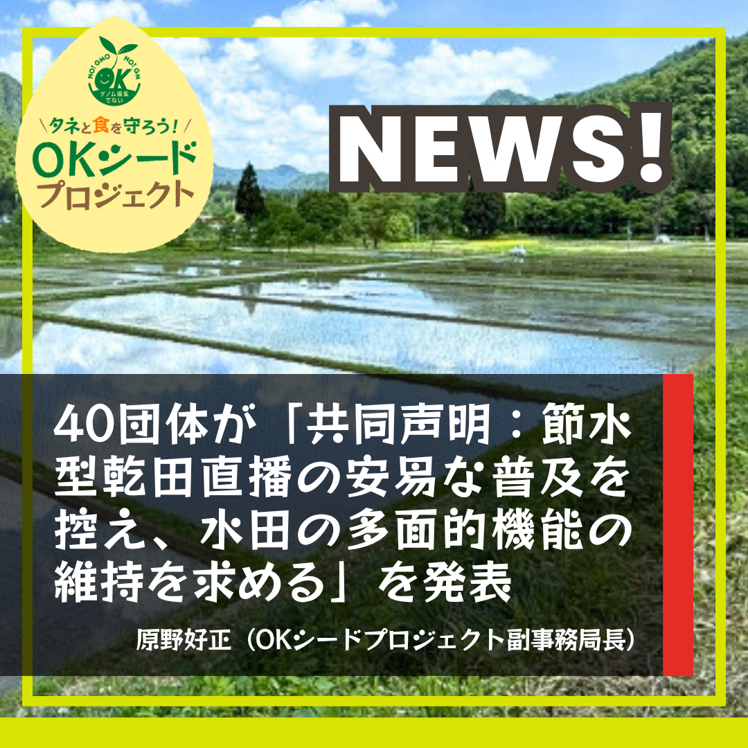 OKシードプロジェクトなど40団体は、「共同声明:節水型乾田直播の安易な普及を控え、水田の多面的機能の維持を求める」を2025年10月27日付で発表しました。この共同声明は、OKシードプロジェクトと日本消費者連盟、ラムサール・ネットワーク日本が呼びかけたもので、環境団体・消費者団体・食の安全に関わる団体などが賛同しています。