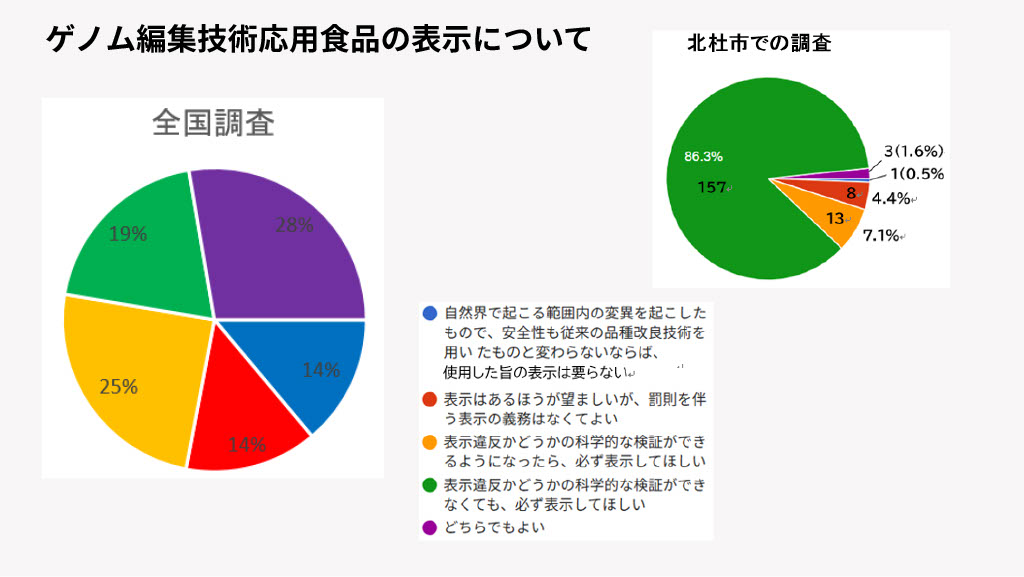 北杜市で意見書採択に取り組んだ市会議員の中村典子さんは、生活クラブ山梨生協の元理事で、2022年に北杜市議会で採択された「北杜市の小学校にゲノム編集トマト苗を受け取らないことを求める請願書」では請願人として活躍された方。今回は請願「ゲノム編集食品の表示の義務化を国に求める意見書提出に関する請願書」の紹介議員として、意見書採択に関わったとのことです。特筆すべきは、ゲノム編集食品の表示について市民がどのように考えているのか、北杜市民に対して独自に調査して9割以上の市民が表示を希望している事実を突き止めたことでしょう。その結果、この請願は20259月議会で委員会での審議を経て、本会議で「ゲノム編集食品の表示の義務化を国に求める意見書」が採択されたのです。