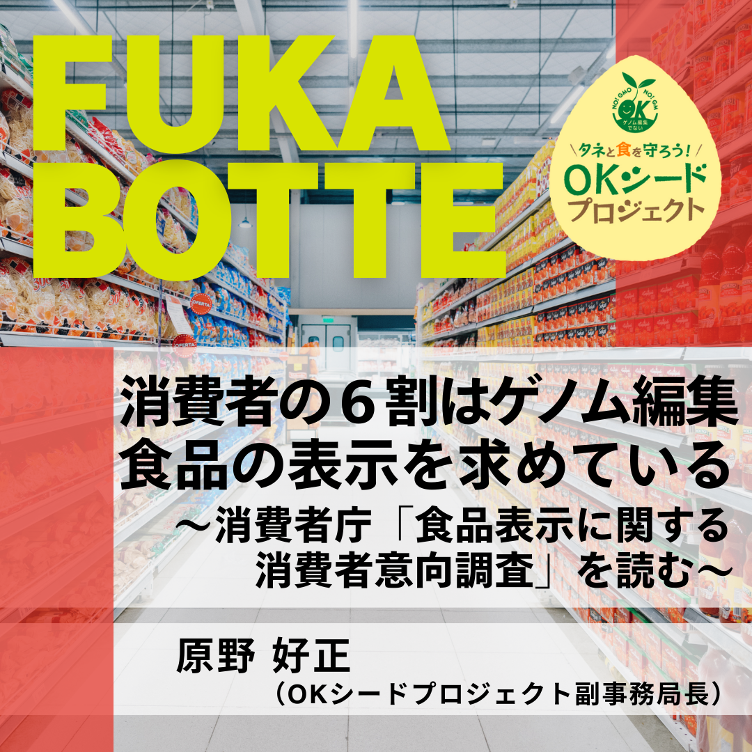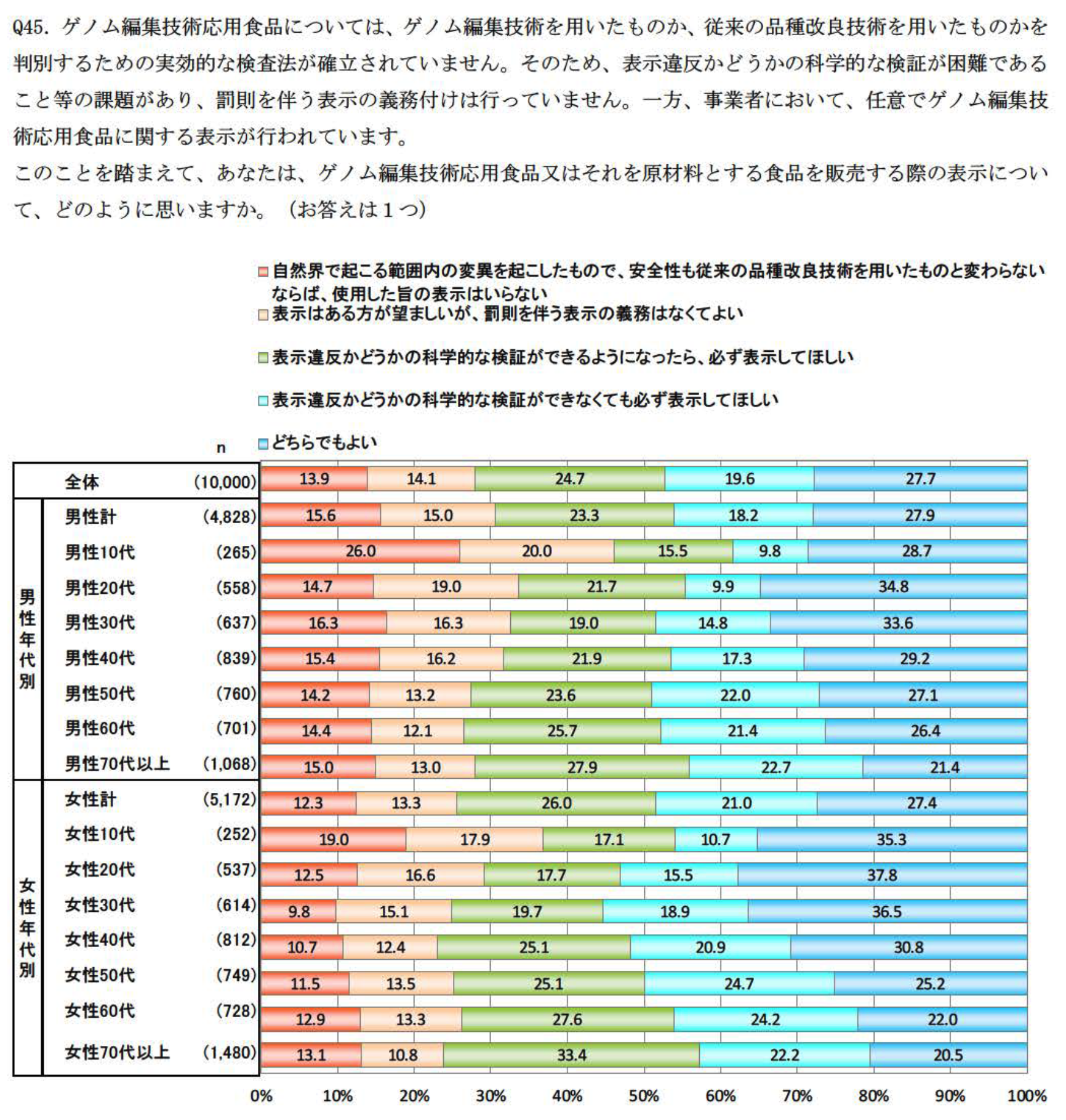 いずれにしろ、この設問からは「ゲノム編集食品は安全です」となんとか伝えたいという思惑が見え隠れしています。しかし、前述したとおり、消費者の約6割はゲノム編集食品の表示を求めているのは事実です。消費者庁はこの事実を真摯に受け止め、ゲノム編集食品表示の義務化を進めるべきではないでしょうか。