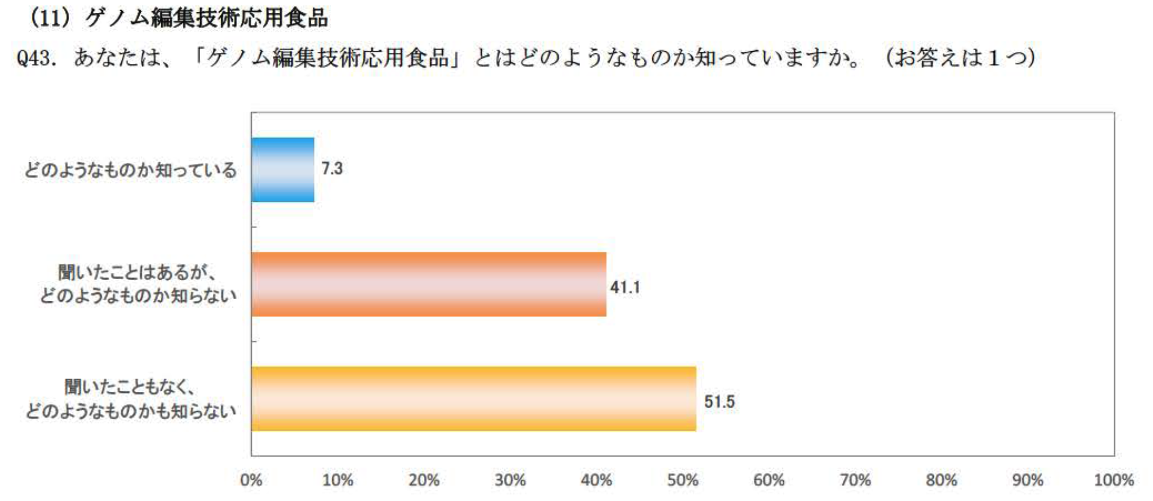 消費者庁が公開した「令和6年度食品表示に関する消費者意向調査」によると、ゲノム編集食品とは「どのようなものか知っている」と回答した人はたった7.3%。「聞いたことはあるが、どのようなものか知らない」が41.1%、「聞いたこともなく、どのようなものかも知らない」が51.5%。つまり、国民の半数以上はゲノム編集食品について聞いたこともなく、どのようなものかも知らないのです。