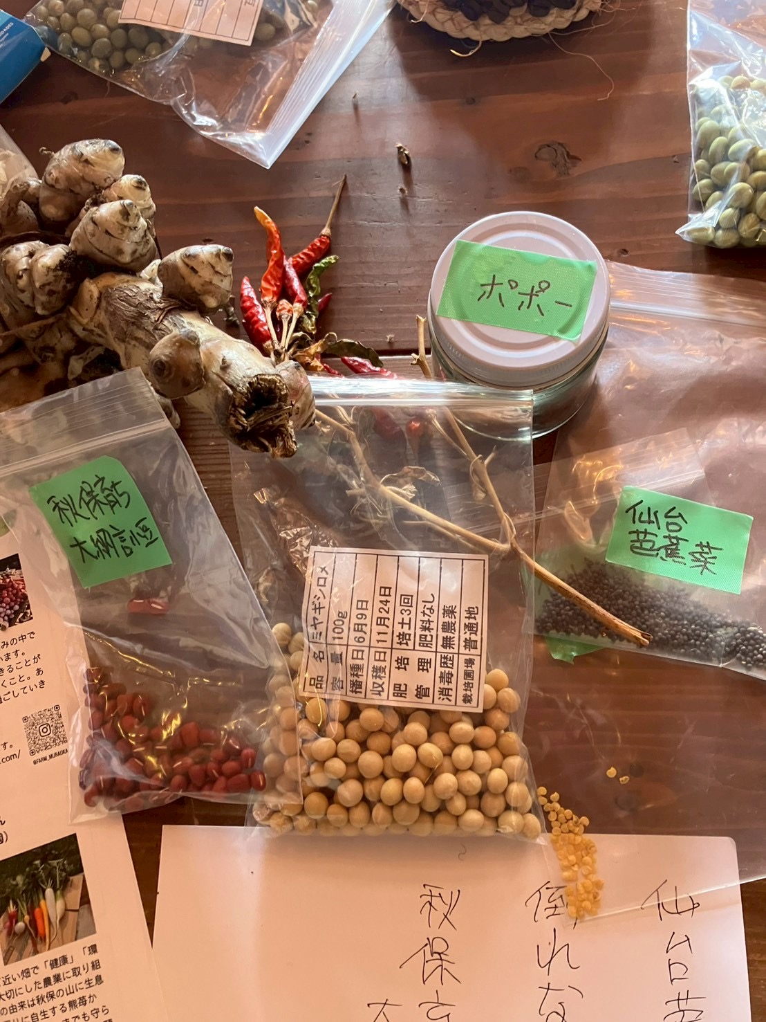 参加の方と農家さんが持ってきたたねと、OKシードプロジェクトからお借りした「たねBOX」からも交換できます。このかわいい木箱は全国を回り、さまざまな地域で採れたさまざまな品種のたねが詰っていて、静岡県富士宮市の農家のSeedおじさんこと鈴木一正さんが管理してくださっています。こちらのたね達も大人気。「自分の繋いだたねが全国を回ると思うとわくわくする♪」とご自身のたねを仲間入りさせた方も。宮城のたね達はどんな地に根をはるのでしょう。