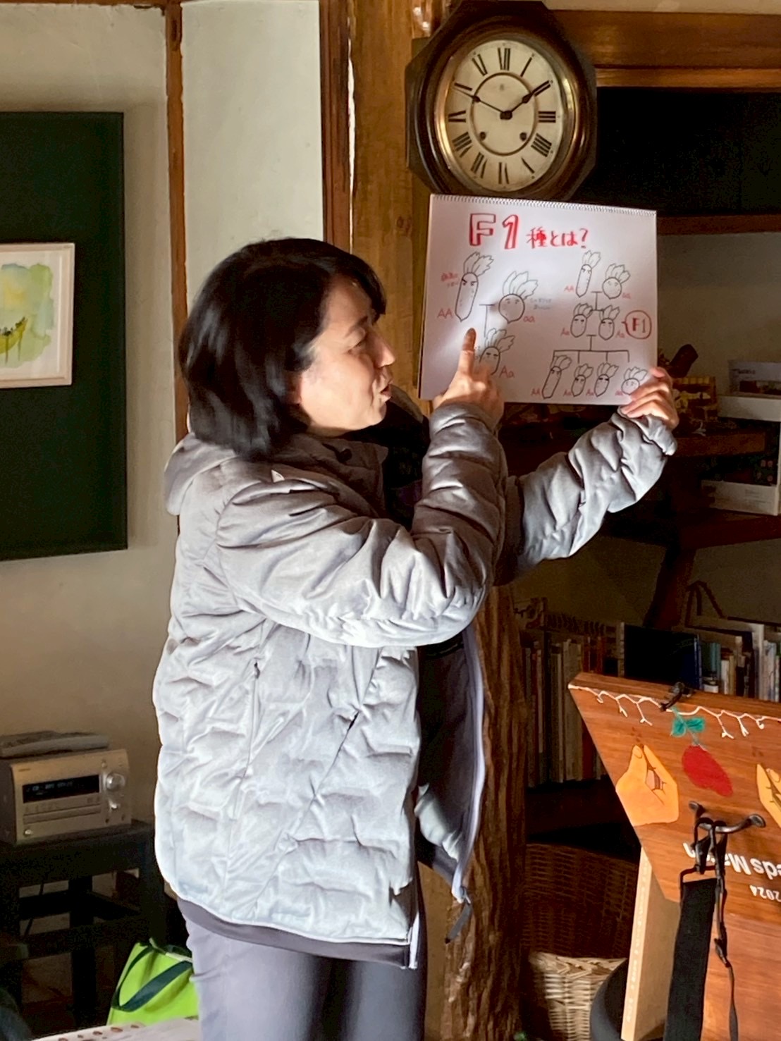 農家さんと主催者の簡単な自己紹介のあとは、「交換できるたね」について自作の紙芝居を使ってお話しました。在来種・固定種・F1品種はどんなたねなのか、F1品種はなぜたね採りに向かないのかを分かりやすくイラストにして説明し、みなさんの共通理解のもと、たね交換会がスタートしました。