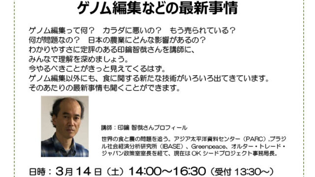 「ゲノム編集などの最新事情」印鑰智哉さんによる講演会ゲノム編集って何? カラダに悪いの? もう売られている?何が問題なの? 日本の農業にどんな影響があるの?わかりやすさに定評のある印鑰智哉さんを講師に、みんなで理解を深めましょう。今やるべき...
