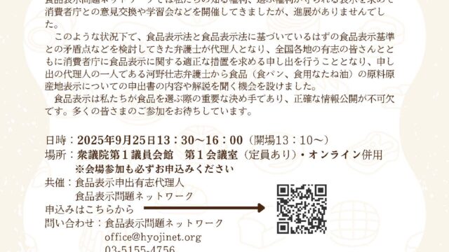 食品表示問題 講演会 歪められる食品表示 「食用ナタネ油」の原材料は「食用ナタネ油」ってホント? 近年、企業の「実行可能性」を重視した方向で、食品表示が変えられています。食品表示問題ネットワークでは私たちの知る権利、選ぶ権利が守られる表示を求めて、消費者庁との意見交換や学習会などを開催してきましたが、進展がありませんでした。このような状... 2025.09.02 食品表示問題